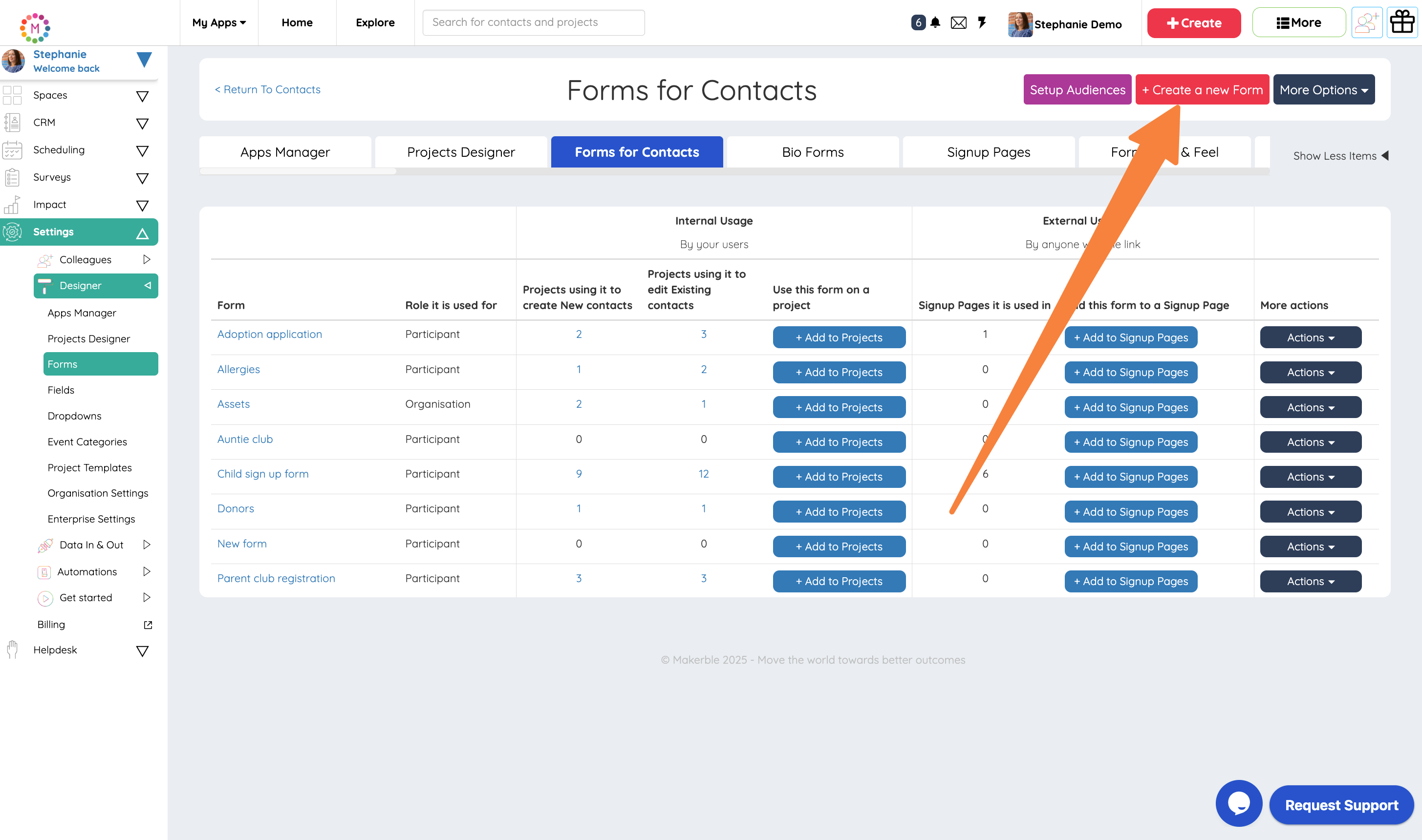 2. Create a form to register the details of volunteer mentors (Left Side Menu --> Settings --> Designer --> Forms)