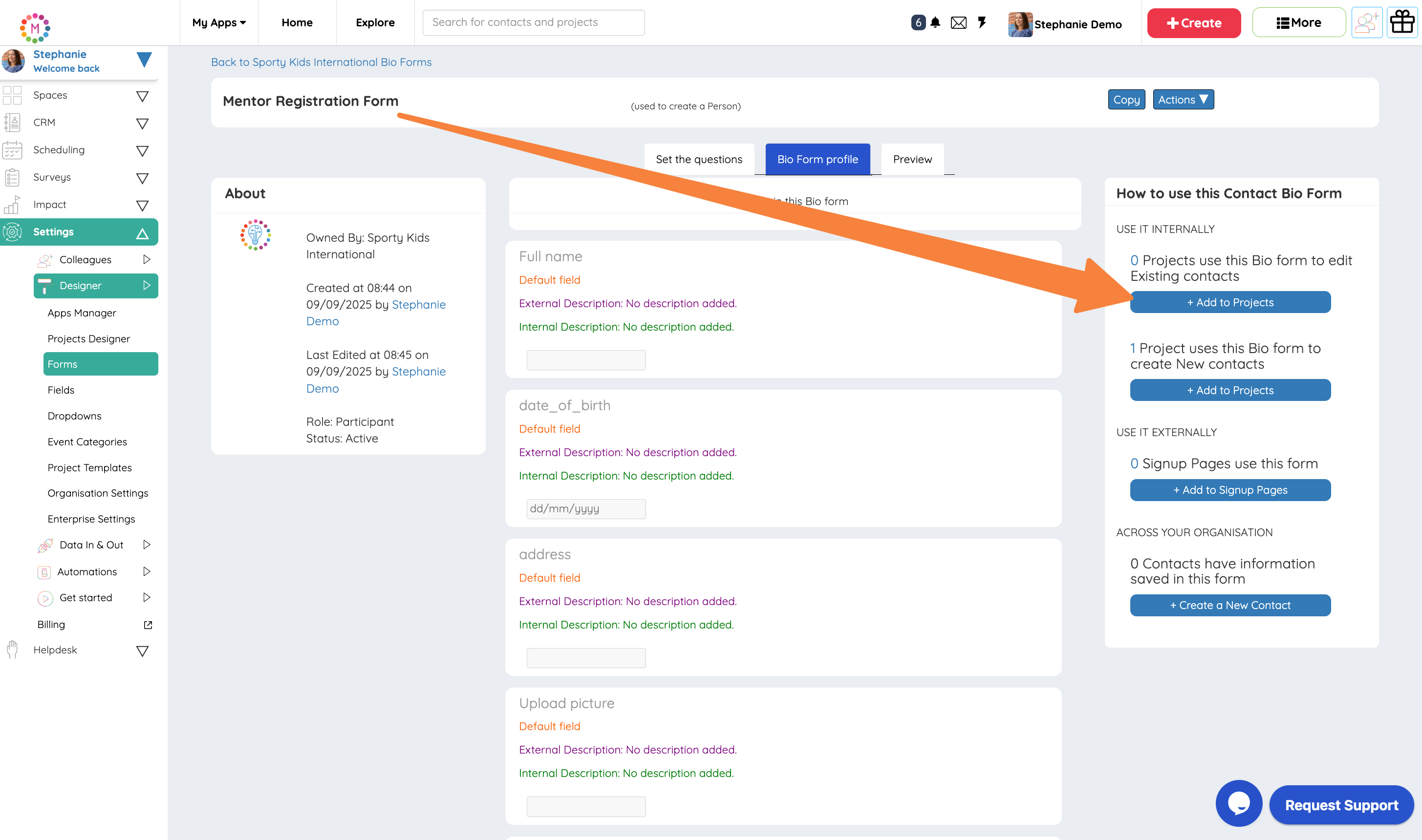 3. Now that your Mentor Registration Form exists, click Add to Projects and choose the Mentors project. This will allow you to now either import mentors from a spreadsheet or type them in manually