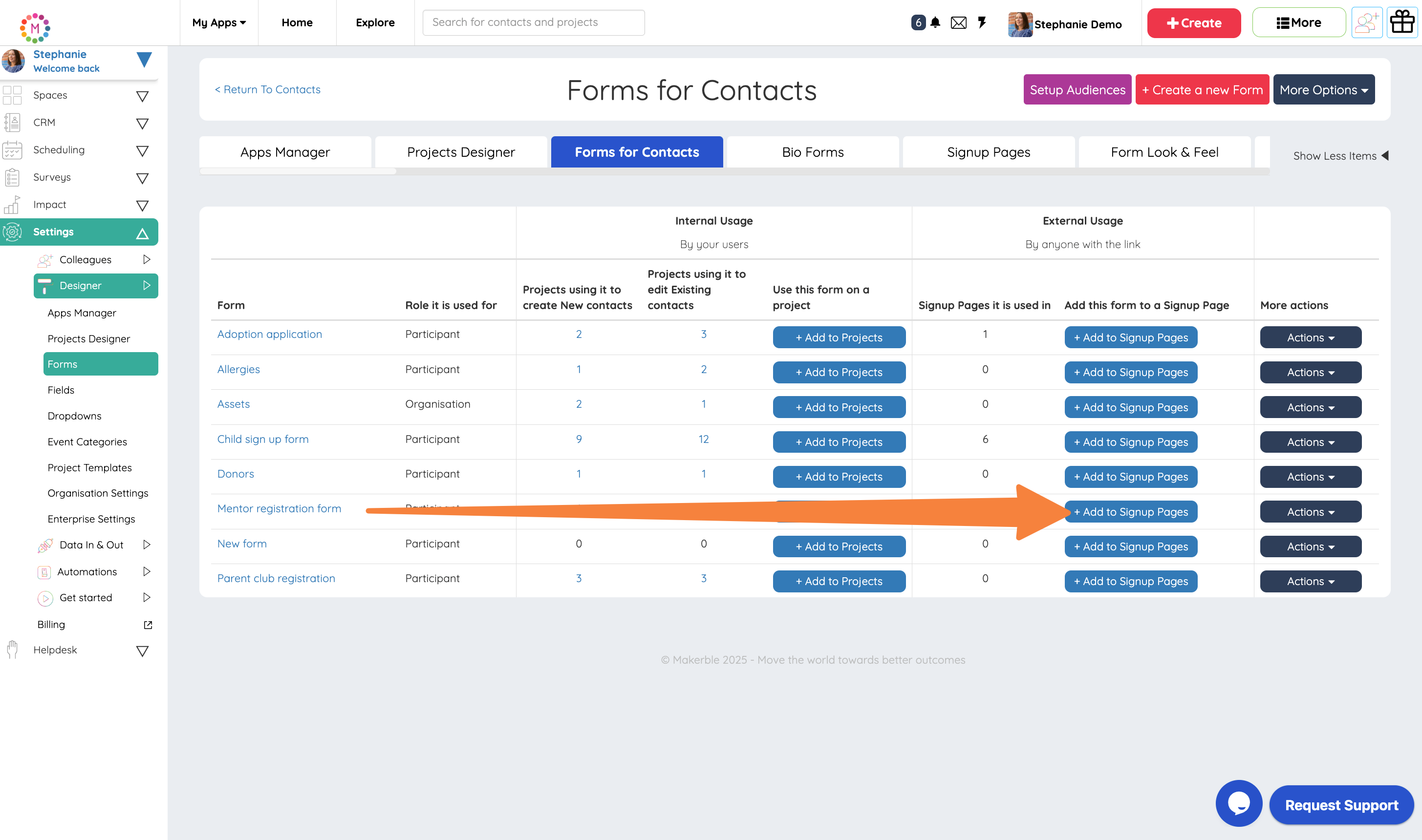 4. If you'd like to publish your Mentor Registration Form externally - go back to the Forms page --> click the Add to Signup Pages button --> click Create a new Signup Page