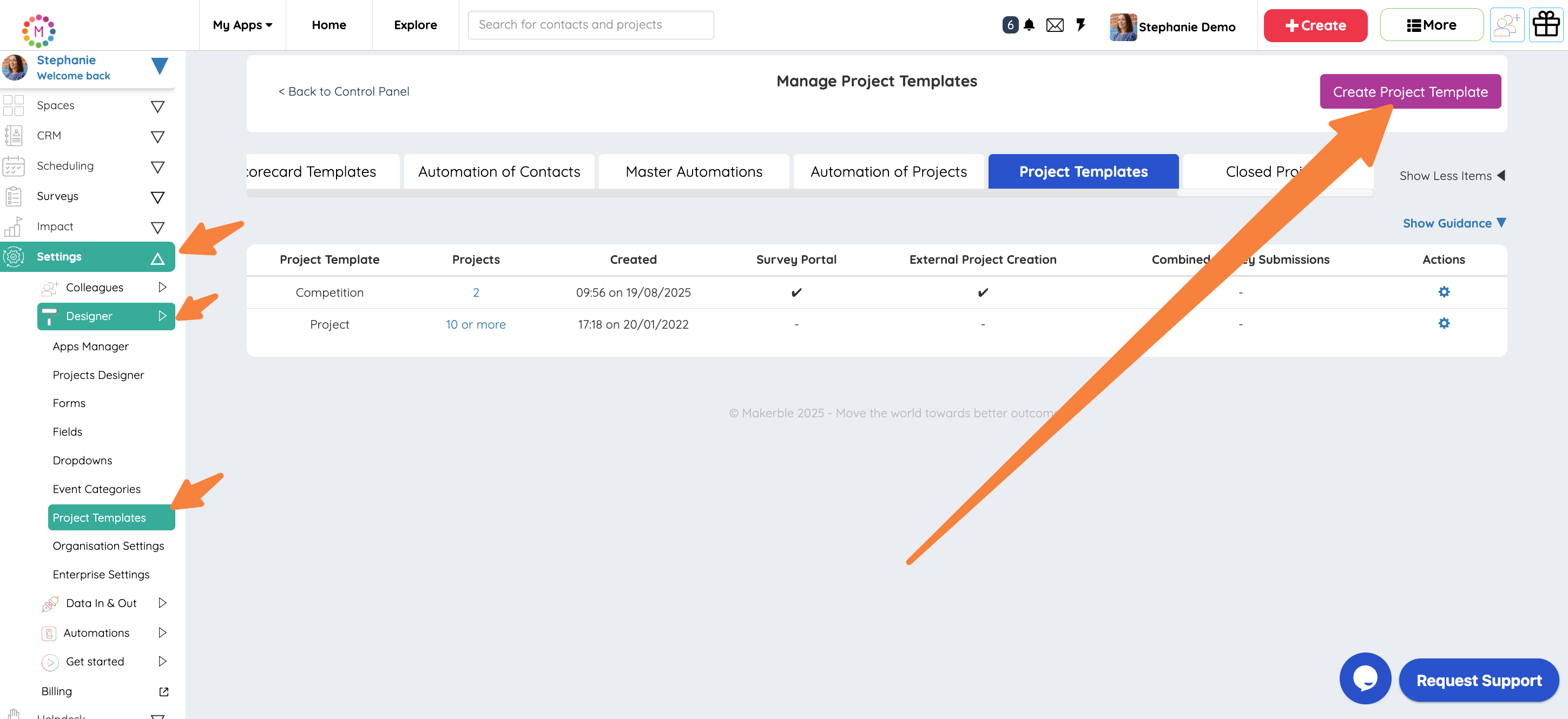 5. Create 2 project templates called Training Programmes and Mentoring Programmes (go to your Left Side Menu --> Settings --> Designer --> Project Templates)